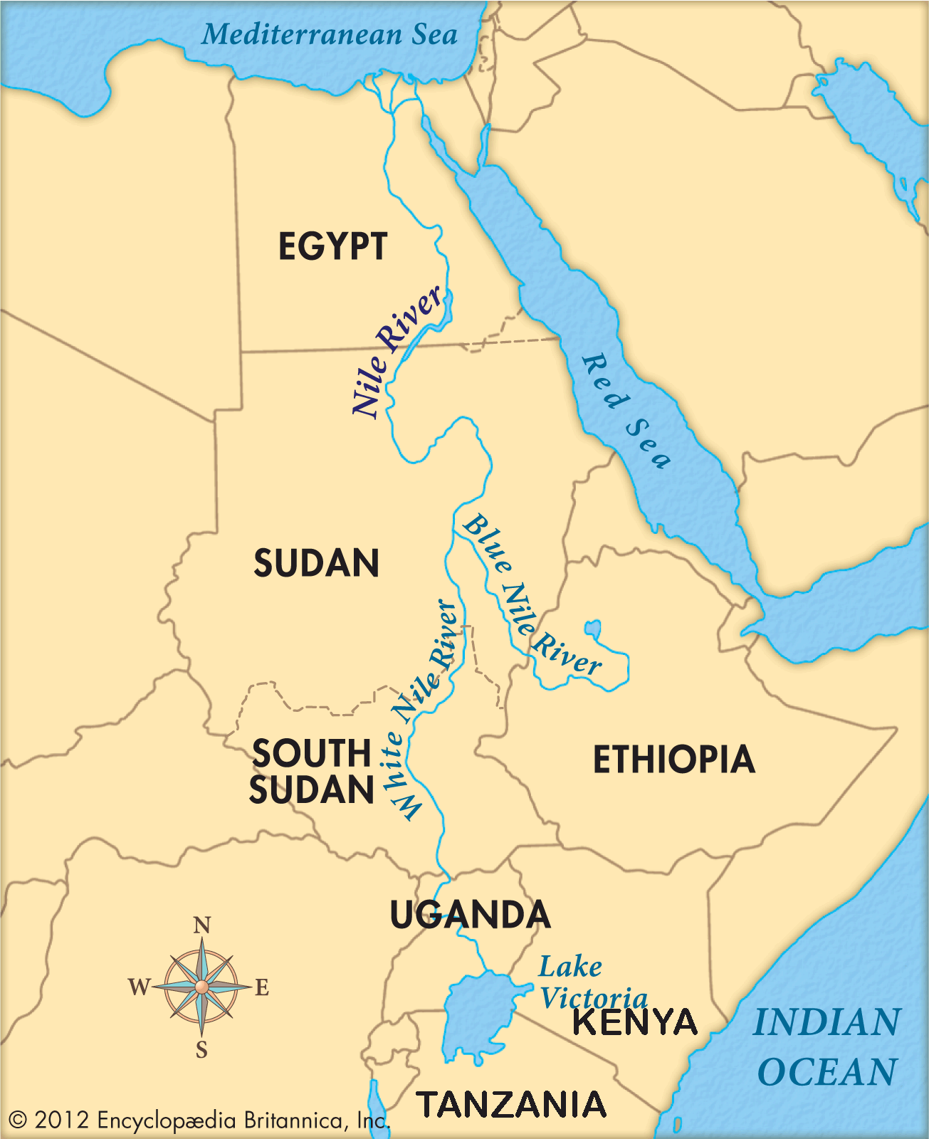 flowing river in northeastern Africa. It starts from "big" Lake Victoria (located in Uganda, Kenya, and Tanzania) and it flows through Egypt into the Mediterranean Sea. |