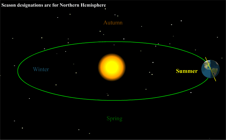 How it Works: The primary cause of Earth's seasons is the tilt of its axis as it orbits the Sun. As Earth orbits the Sun, the tilt remains fixed in space. Because of this tilt, different parts of Earth receive the Sun's most direct rays at different times of the year. |